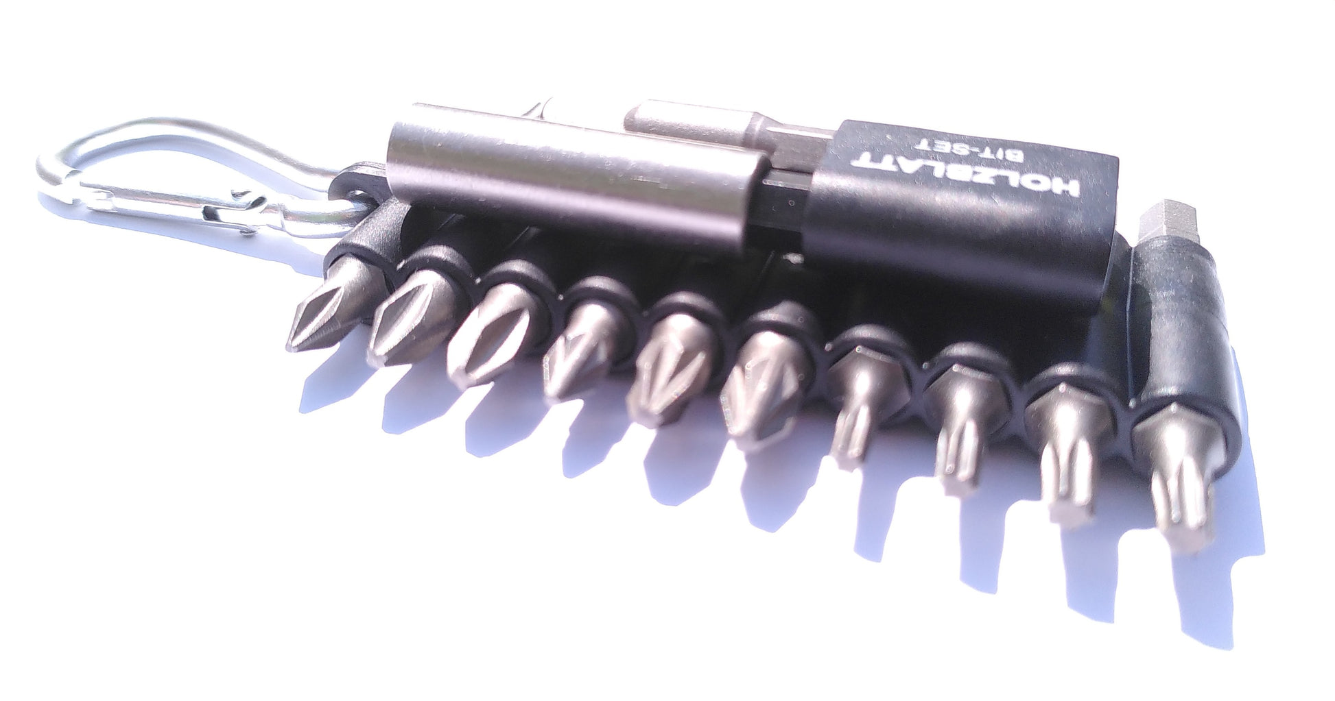 Das Bit-Set eignet sich für eine unkomplizierte Entnahme der Bits. Der Karabiner ermöglicht eine einfache Befestigung an Ösen oder Metallringen.